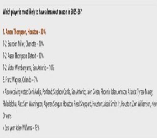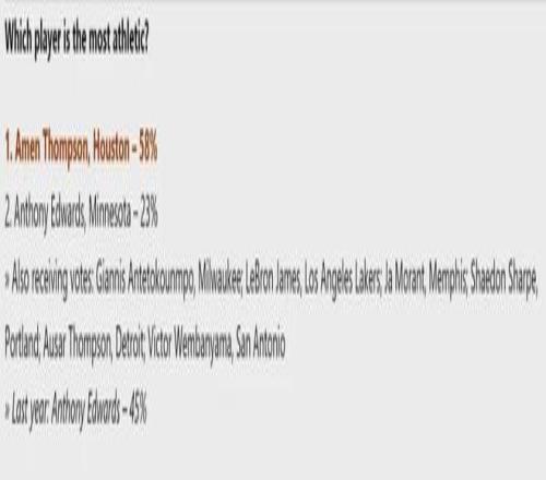 杜兰特此次降薪正是为了帮火箭减轻薪资压力,续约伊森和阿门-汤普森。今年休赛期,NBA官方组织各队总经理投票,阿门在两项投票中排名第一:1、新赛季最可能爆发的球员(文班等人并列第二);2、运动天赋最出色的球员(爱德华兹第二)。