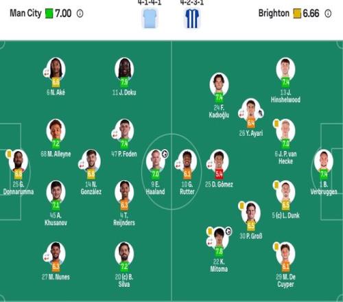 曼城首发:25-多纳鲁马、27-努内斯(73'82-刘易斯)、45-胡桑诺夫、68-阿莱恩、6-阿克(64'33-奥赖利)、14-尼科·冈萨雷斯(73'16-罗德里)、20-B席、4-赖因德斯、47-福登(73'10-谢尔基)、11-多库、9-哈兰德