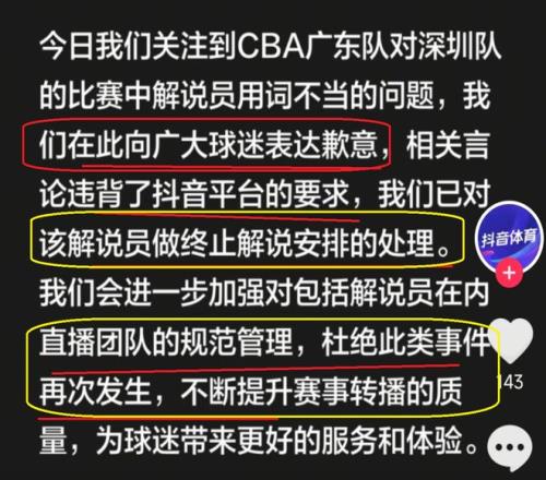 于是,也是有很多广东队球迷进行投诉,结果,大家也是看到了,抖音平台在第一时间,对该解说员进行处理,终止了他解说员的资格。与此同时,抖音平台还向广大的球迷进行了道歉。