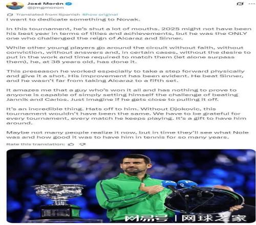 José Morón的文中最有远见的部分,或许是对德约科维奇历史地位的预判:“或许现在很多人还没意识到,但随着时间的推移,终将有人领悟他多年来在网坛精彩表现的非凡意义——拥有他征战网坛的岁月何其珍贵。”